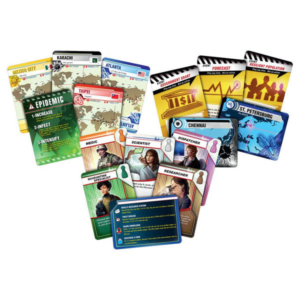 The game board depicts several major population centers on Earth. On each turn, a player can use up to four actions to travel between cities, treat infected populaces, discover a cure, or build a research station. A deck of cards provides the players with these abilities, but sprinkled throughout this deck are Epidemic! cards that accelerate and intensify the diseases' activity. A second, separate deck of cards controls the "normal" spread of the infections.