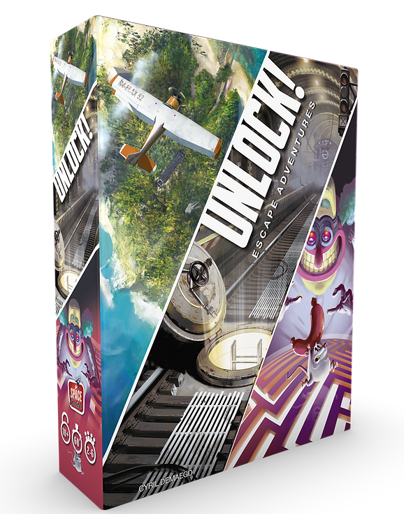 UNLOCK! is a series of escape adventures for up to six players. With one hour on the clock, players must work through a deck of sixty cards as a team, searching for clues, combining objects, and solving puzzles. The free UNLOCK! companion app runs